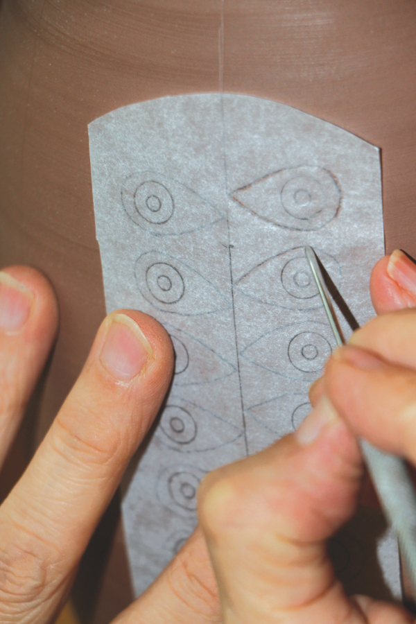 Grid lines are drawn as the reference on trimmed, leather-hard pots (2) and then patterns are transferred on the piece using a needle tool with a rounded tip (3). I apply just enough pressure to draw lines on the paper without tearing it. I can usually use a paper stencil over 20 times.