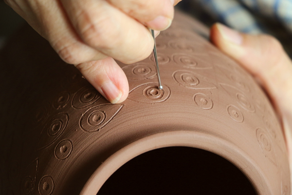 Carving starts with tracing transferred lines with a needle tool to make them deeper. Then a double-ended ball stylus and small wire loop tool are used to make the pattern wider and deeper as the leather-hard ware dries (4, 5). Generally speaking, the