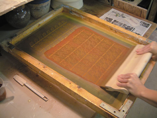 Position the silk screen on top of the prepared paper (figure 1). Pour a bead of black slip on the screen at one end only (figure2). Squeegee slip across the screen with steady, even pressure (figure 3).