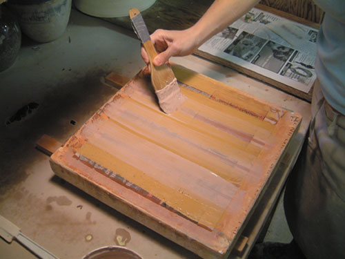 goes away or you’re ready to use. I often apply up to four applications of white slip depending on how thick I want the slab to be. Usually though, one application is enough (figure 7).