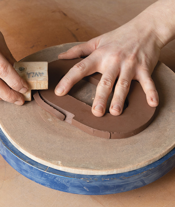 Next, bevel and score the edge of the ½-inch-wide (1.3-cm) clay strip, as well as the beveled edge of the base. Press the strip onto the base to form the outer cuff (4), cutting the strip’s ends at a 45° angle for a stronger joint. Soften the edge by pinching or using a damp sponge, and smooth the exterior edge with a rubber rib. Allow the base to firm up before flipping it over to finish the bottom.