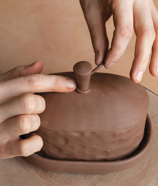 Finally, roll a chunk of clay into a knob shape (16), attach it to the center of the lid (17), and reinforce it with a decorative coil (18). With this final touch, your butter dish is complete.