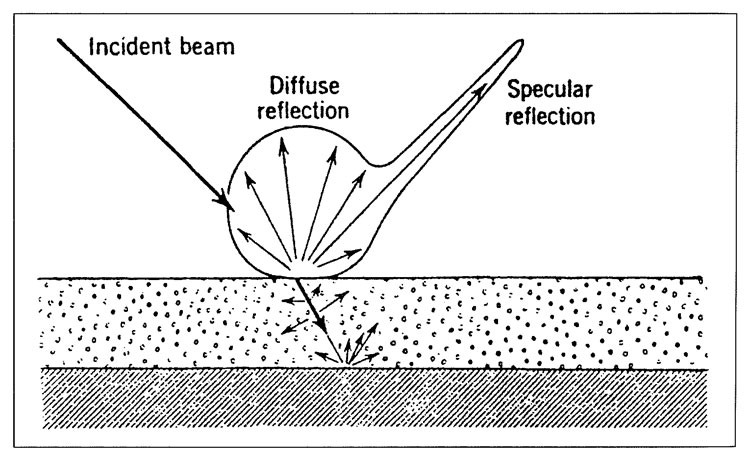 Diffuse Reflection: Reflection of light from a surface where the incoming light is reflected in many or all directions.