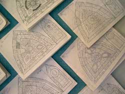Clay is a most adaptable and forgiving medium for community-based art. People of all ages can participate, learning while they playfully handle materials and tools. With a clear plan for how to produce and use thousands of unique small pieces, something surprisingly luxurious can be achieved. Clear planning was essential for Summit County Day School in Cincinnati, Ohio, during a seven-month residency creating art for the foyer of an ornate Gothic chapel. The order was a tall one: design and fabricate two 9 X 36-inch mosaic, donor panels to honor over 600 generous benefactors. Hundreds of engraved metallic nameplates would cover the finished surfaces, suggesting something of a Byzantine style. Divided into groups of five to twenty, more than 200 students attended my in-school ten-week workshop. The workshop was held in the timeframe of four art class periods each day, and assistants and apprentices worked during after-school hours. For many of the 8-13-year-old participants, this was their introduction to clay.