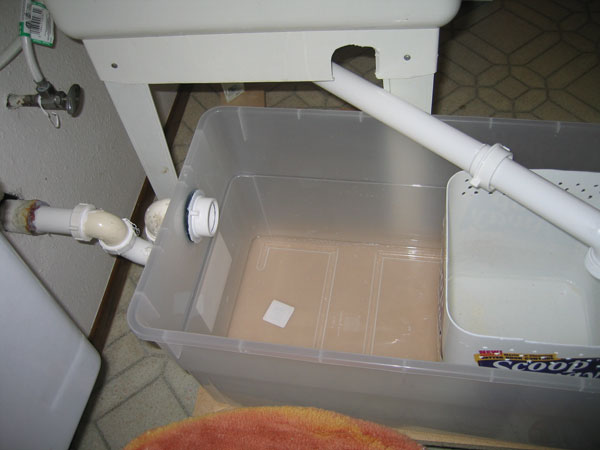 The height of your trap depends on the height of the sink outlet and the waste pipe. Because my sewer drain is high, I had to raise both my sink and the trap (fig. 2). You may not have to do this. The sink legs are fastened to the blocks so they cannot be kicked out. Hooking up the trap is easy. Use washers and silicone to make a watertight seal for the drain (fig. 3). Locate the smaller square bucket at the end farthest from the drain. Even if there is a lot of clay water flowing out from the inner bucket it will still flow on the sides, which are farther away from the main outlet, giving enough time for the clay to settle before the water goes out.