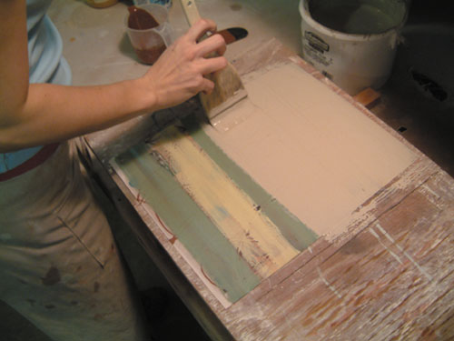Items you need: squeegee, spatula, metal rib, small pitcher, brushes, a pointed tool, and various colored slips. Prepare paper the same way as in the previous examples.