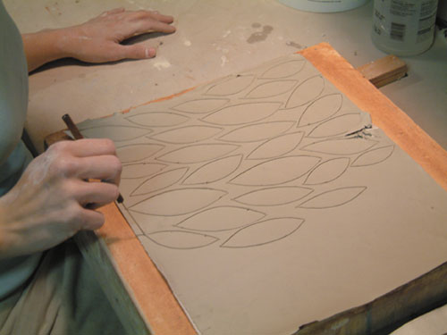 Take another piece of paper and place it over the pattern. Make sure to smooth it out, as this helps remove moisture (figure 11). Flip the slab over and remove the paper and now you’re ready to cut shapes to apply to your pot, based upon