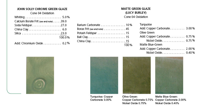 Chromium oxide gives a reliable green, unaffected by kiln atmosphere, although it is volatile at high temperatures. Cobalt and chrome combine to make teal blue-greens. In alkaline glazes, a bright chartreuse green may be obtained using a small amount (0.2%) of chromium oxide. Zinc should be avoided in chrome glazes, as it turns the chromium brown. Cobalt and titanium or rutile can produce a pale green in high-alumina glazes and slips. Nickel and titanium will give green in magnesium matte and zinc crystalline glazes.