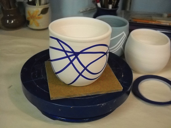You can also use the tape on greenware; you just have to take extra care when pulling, stretching, and pressing. This resist technique is great for layering glazes or slips too, as long as you fire each layer before adding another round of tape.